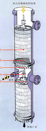 1、规整填料 2、支撑栅板 3、液体收集器 4、降液管 5、管式液体分布器 此结构适合于直径小于800mm的填料塔。